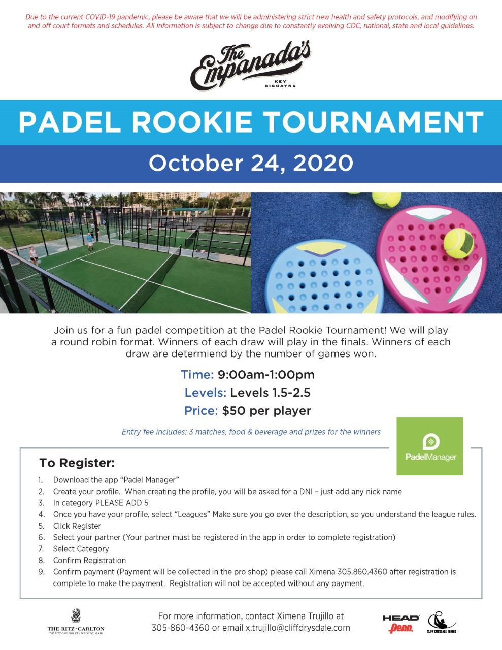 The Padel courts are located at the Ritz Carlton Key Biscayne. The hotel has a variety of restaurants open to the public. A pro shop is also located by the Padel courts, where players have access to the locker rooms, showers and Padel merchandise.